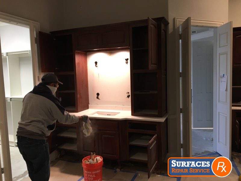 Surfaces Rx revitalizes this smaller vanity, woodwork and cabinets in the master bathroom. We also worked on making the wood look good on the main Master bath Vanity and the master closet's built-in dressers and cabinets.