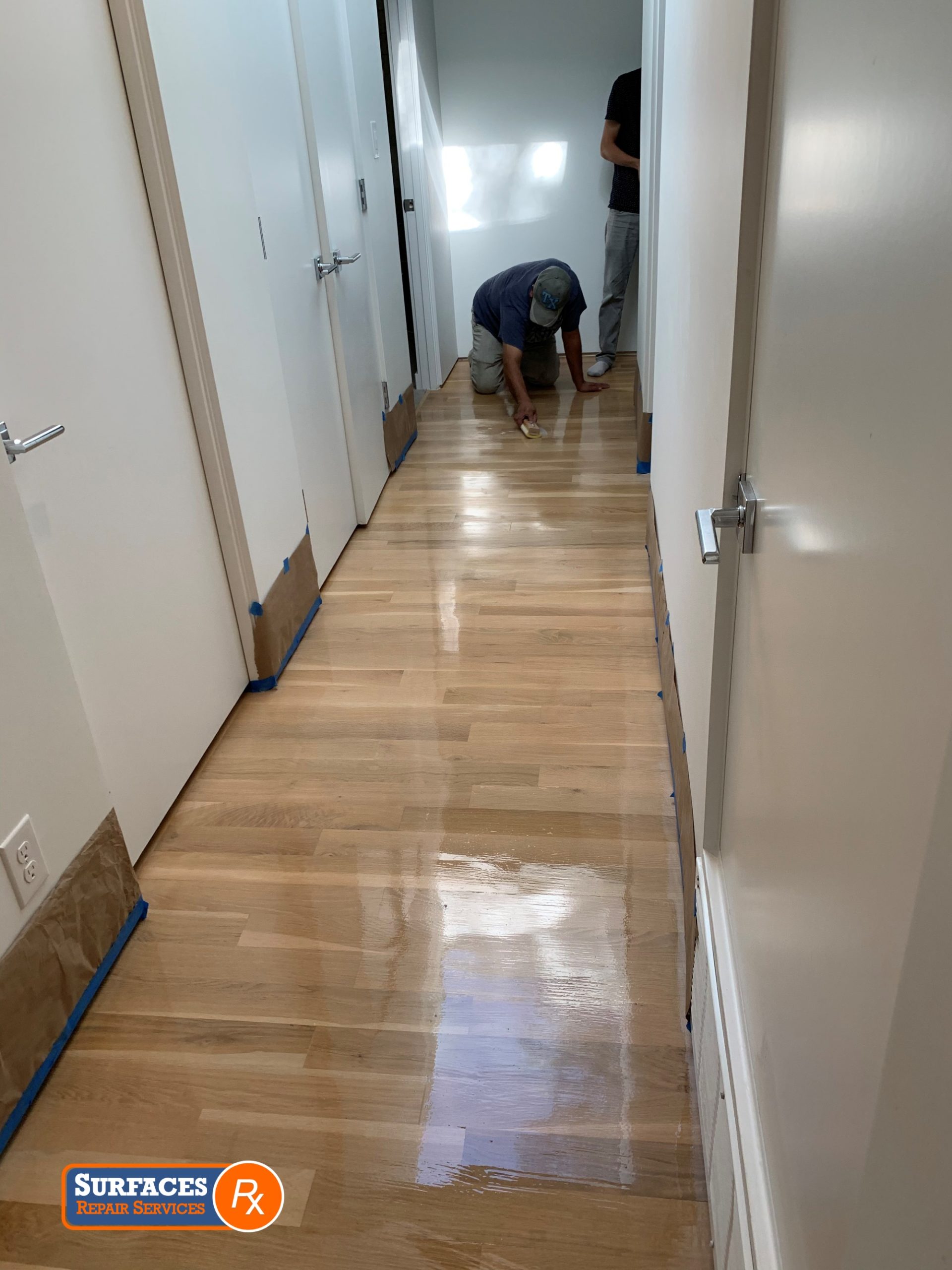 Initially we had planned on completing the repair in one trip, but because of the severity of the damage and the fact the scratches went across the grain, the owner and our Surfaces Rx foreman agreed that we needed to schedule another appointment to refinish the hallway floor.